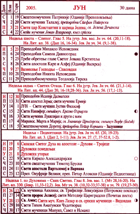 Pravoslavni kalendar za jun 2005